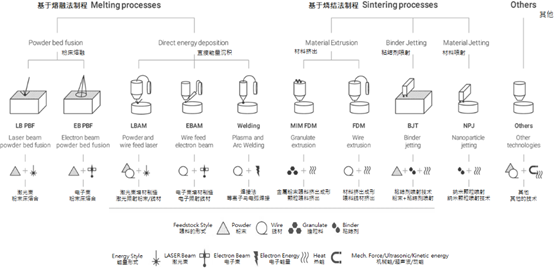 2.3MAM以金屬粉末做為增材制造成形的方式目前有許多的方式,如圖4所表示。大致分成三大類,即將金屬粉末直接熔融法制程(Melting process)和燒結(jié)法制程(Sintering process),這些技術(shù)沒有統(tǒng)一的標(biāo)準(zhǔn),不過隨著技術(shù)的演變,也逐漸將材料、設(shè)備與方法清楚分類,并朝著更小的堆積層分辨率邁進,使用較小范圍的激光光斑、低溫成形(噴膠打印)、高溫同步固化,逐漸擴大產(chǎn)品量產(chǎn)的應(yīng)用范圍以及產(chǎn)出效率的提升,或是朝更高分辨率前進。