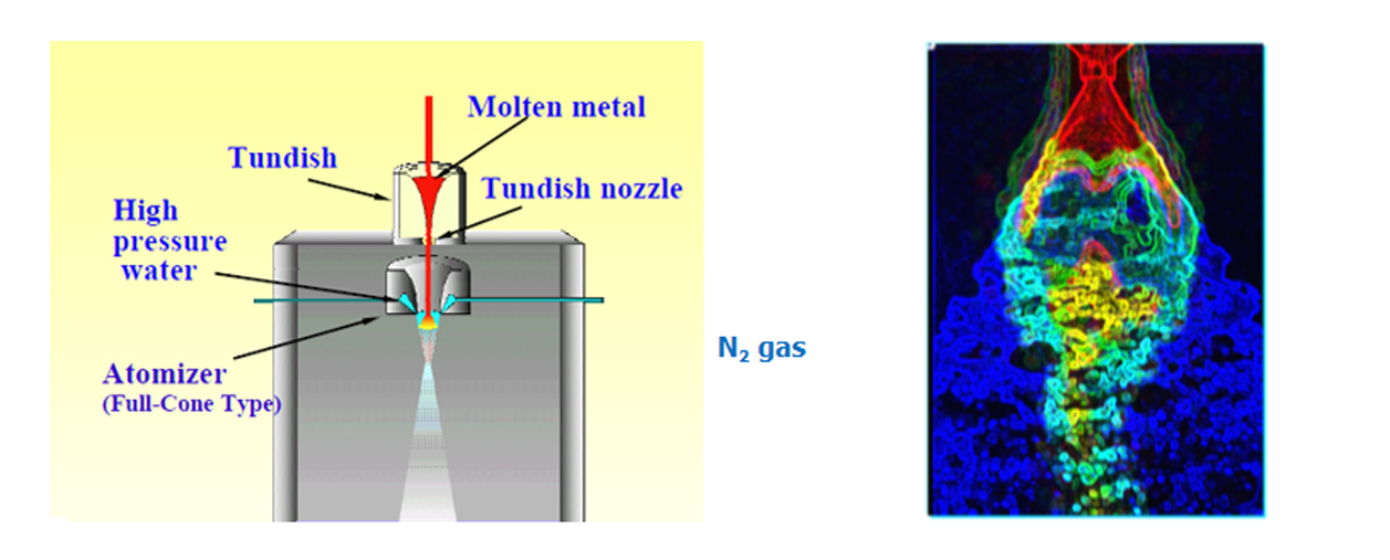 霧化器結構如圖所示,采用此結構設計有如下好處:單一霧化器中實現二步霧化,先是氣體打擊霧化,后是超高壓水打擊水霧化;第一步氣體預破碎并冷卻鋼液,使鋼液液流形成液波及破裂鋼帶,第二步充分利用超高壓水的動能,進一步打擊液流及破裂鋼帶,使之變形和細化成為細小的顆粒粉末;采用該霧化器制備的粉末為近似球形,兼備氣霧化的優異性能,同時細粉產出率高。
